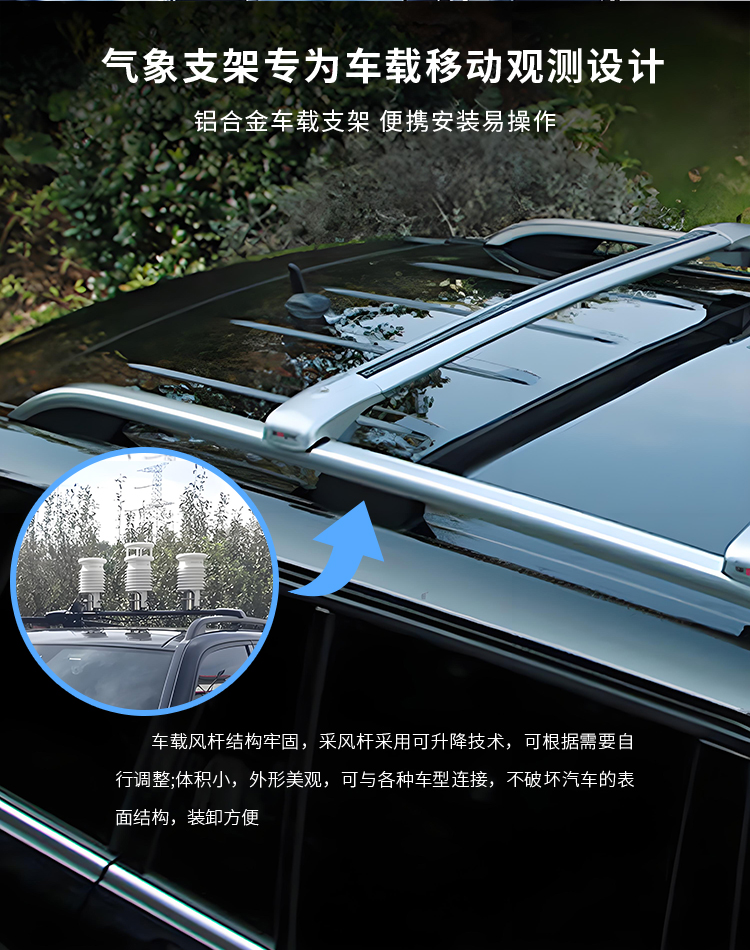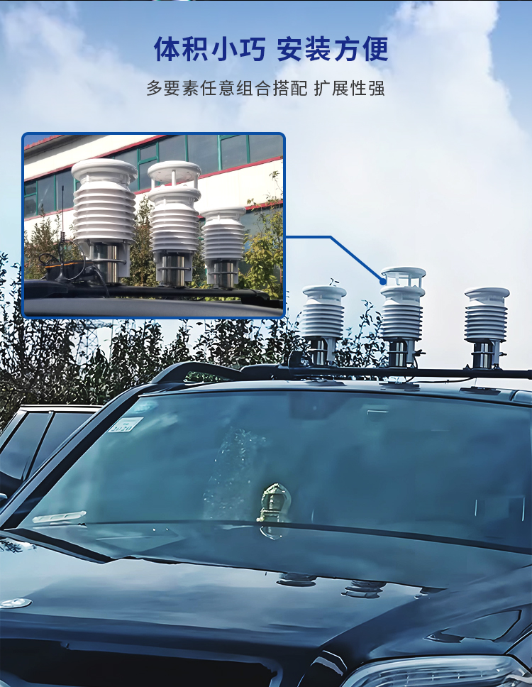 車載氣象站——專門為移動應急環境而設計的一款綜合觀測自動氣象站,集成了高精度傳感器和先進的數據分析系統,它能夠實時監測并準確預報車輛行駛過程中的溫度、濕度、風速風向、氣壓、噪聲、太陽輻射及降水量等關鍵氣象數據、也可以測量PM2.5、PM10、CO、NO2、SO2、O3等氣體和顆粒物指標。無論是在復雜的城市交通,還是在偏遠的野外探險,車載氣象站都能為您的出行提供精準、全面的環境信息。