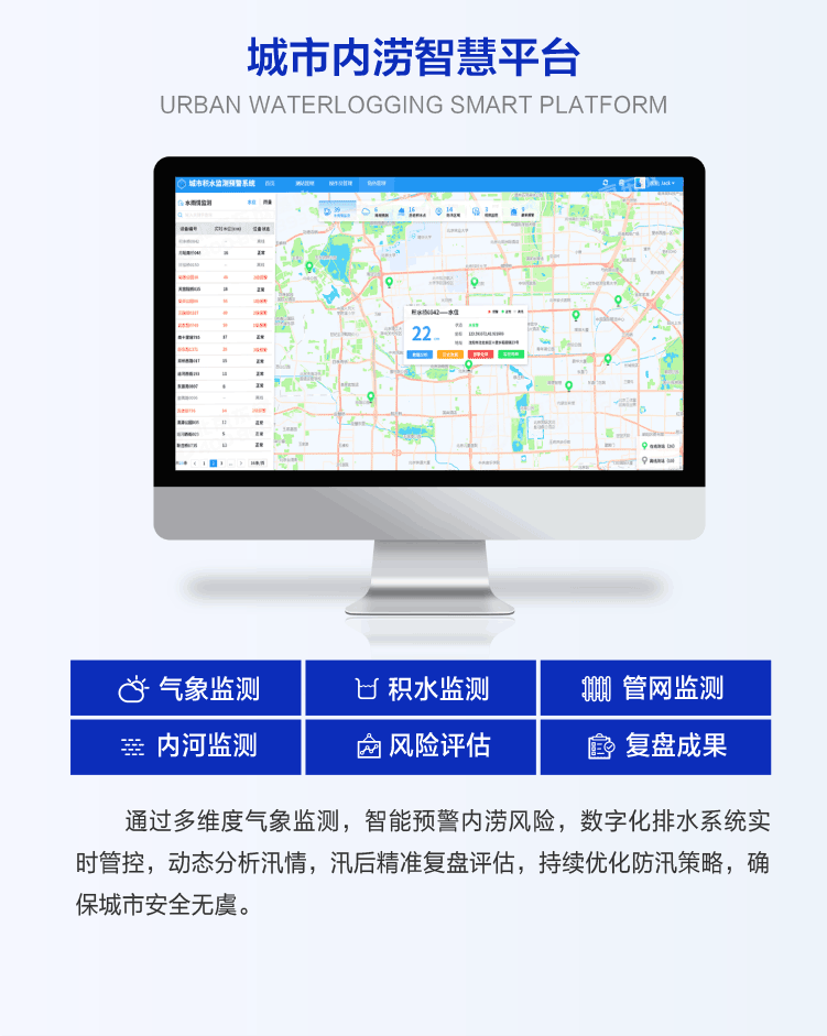 城市內澇預警監測系統是一款集成了先進傳感器技術、數據采集與分析、遠程監測等功能的智能化系統。該系統通過在城市關鍵區域部署水位傳感器、雨量傳感器等設備,能夠實時監測和評估城市內澇積水情況。通過城市內澇預警監測系統,城市管理部門能夠全面掌握內澇積水情況,提高防洪能力和災害應對效率,確保市民生命財產安全。