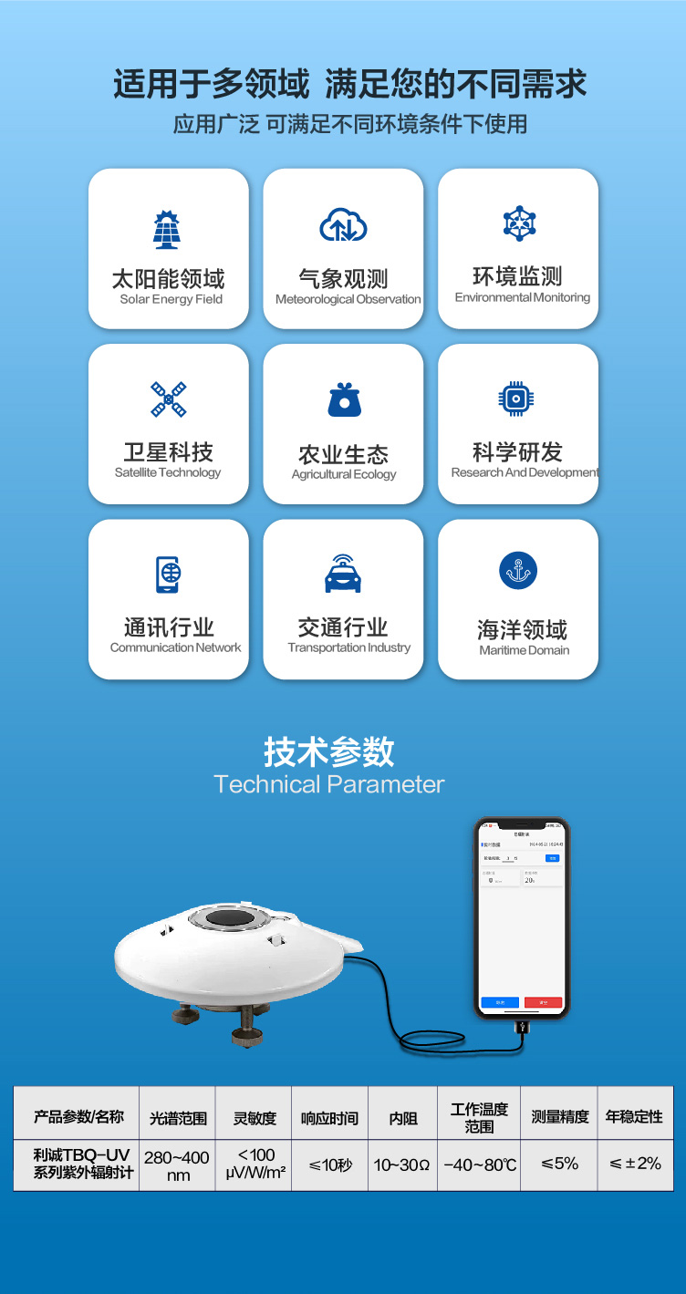 手持紫外輻射計是一款便攜式高精度測量設備,專為快速檢測并量化紫外線(UV)輻射強度而設計。它廣泛應用于環(huán)境監(jiān)測、紫外線消毒效果評估、戶外工作者健康保護、科研實驗以及皮膚保護產(chǎn)品測試等多個領域。通過直觀的數(shù)字顯示,用戶可輕松掌握紫外線強度,有效預防紫外線過量帶來的危害,確保工作與生活環(huán)境的安全與健康。